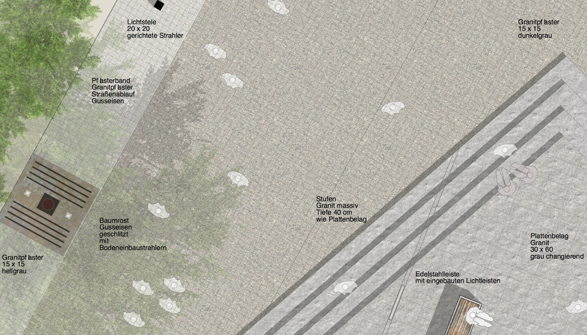 Der Hauptzugang am Braker Weg wird durch eine leicht geneigte, dreieckige Platzfläche gekennzeichnet. Stufen entlang der Wegeverbindungen machen die Platzfläche erlebbar und bieten Sitzgelegenheiten zum Verweilen. Auf der Westseite des Platzes entlang der Raumkante entsteht eine Achse, die den Übergang "Bahnhaltestelle" und den Anschlusspunkt "Johannes-Schuchen-Straße" direkt miteinander verknüpft.