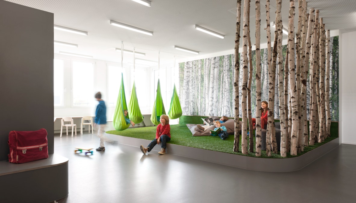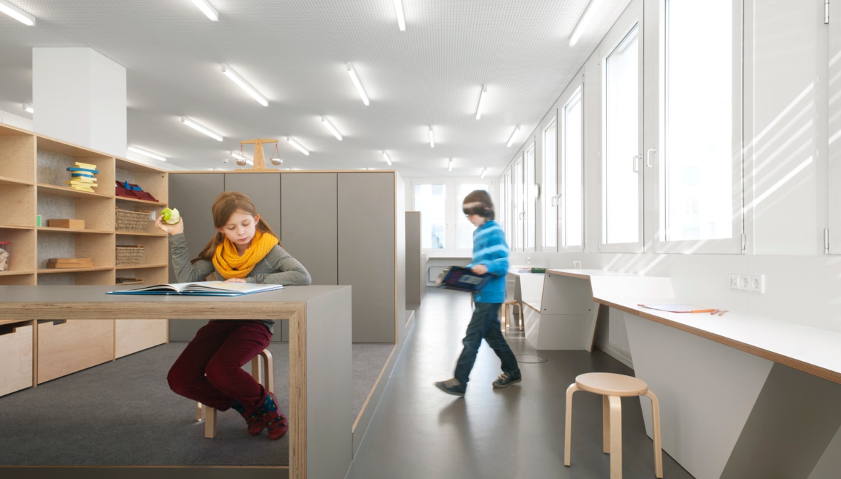Die zur Verfügung stehende Bürofläche wurde bis auf die Technikkerne komplett entkernt. Es entstanden zwei große Räume, in denen freistehende Einbauten, entsprechend dem pädagogischen Konzept der Schule, unterschiedliche Tätigkeiten unterstützen. Der Aktionsbereich, mit Garderobe, Labor, Atelier und Bewegungsraum sowie der Arbeitsbereich mit zwei differenziert ausgestatteten Lerninseln. Eine raumhohe Schrankwand bietet mit eingebauten Raumnischen (Lesehöhle, Zirbelstube) Rückzugs- und Ruheräume an. Entlang der Fassade befinden sich umlaufend die Einzelarbeitsplätze in unterschiedlicher Höhe, so dass sitzend oder stehend auch individuell gearbeitet werden kann.