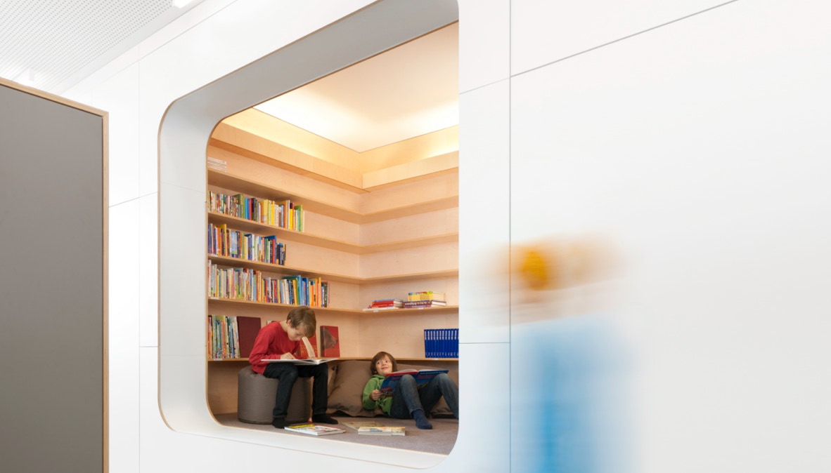 Die Rückwände der offenen Regale sind mit naturfarbenem Filz kaschiert, was einerseits optisch warm und natürlich wirkt und andererseits einen schalldämpfenden Effekt hat. Es entstehen so Bereiche, die in Relation zur Tätigkeit des Schülers, unterschiedliche Stimmungen, von eher neutral bis warm und geborgen, erzeugt.