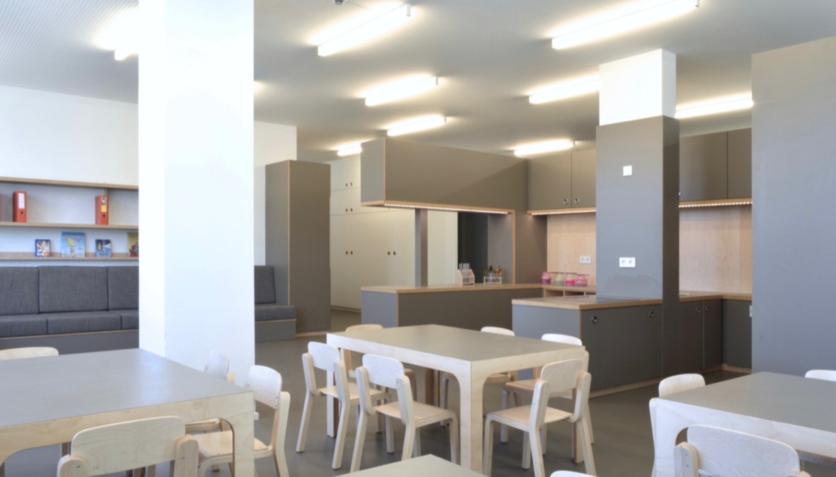 Das Raumkonzept wurde in Anlehnung an die Gestaltung der Grundschule im 2. Obergeschoss entwickelt. Der große Eingangsraum ist mit einem zentralen halbhohen Einbaumöbel, dass die Funktionen Garderobe, Küche und Labor anbietet, in Raumzonen unterteilt. Die Garderobe begrenzt den Eingangsraum, die Küche ist zum Marktplatz hin ausgerichtet.