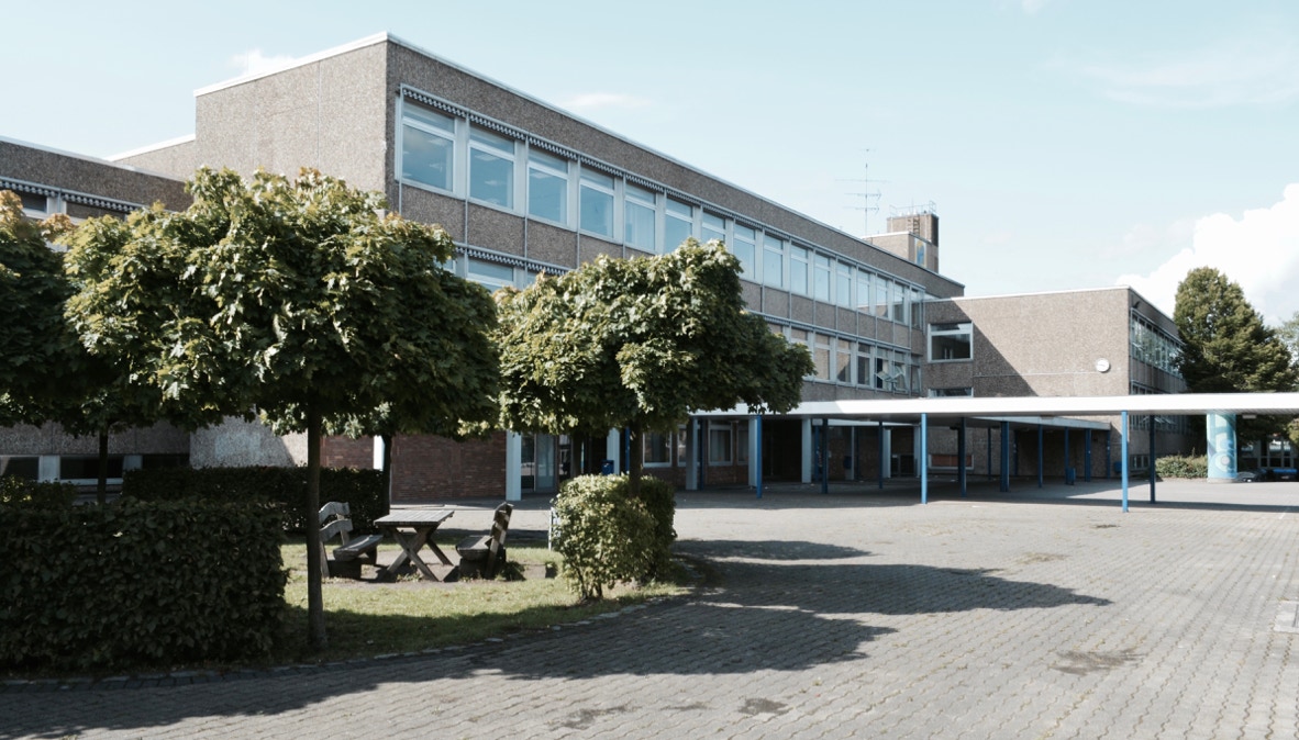 Die Waschbetonfassade des Märkischen Gymnasiums in Hamm ist sanierungsbedürftig. Die fortschreitende Korrosion der Armierung führt zu Abplatzungen, Teile der Fassade mussten bereits abge-nommen und durch Provisorien ersetzt werden.
