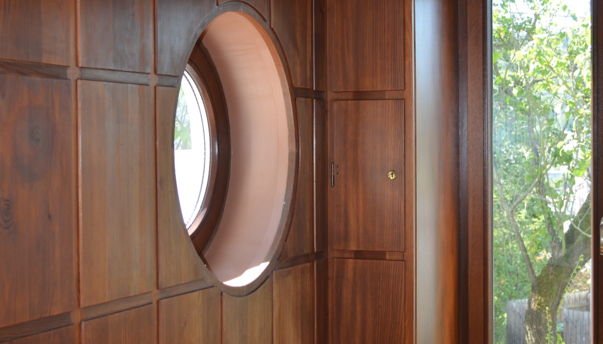 Ein kleines Bad, das bisher als Durchgangsraum zu den Schlafräumen diente, wurde separat erschlossen und mit einer Schiebewand aus Eichenholz und Glaselementen vom Flurbereich getrennt. Glasflächen, Muschelkalk und Eichenholz bestimmen den Raum.