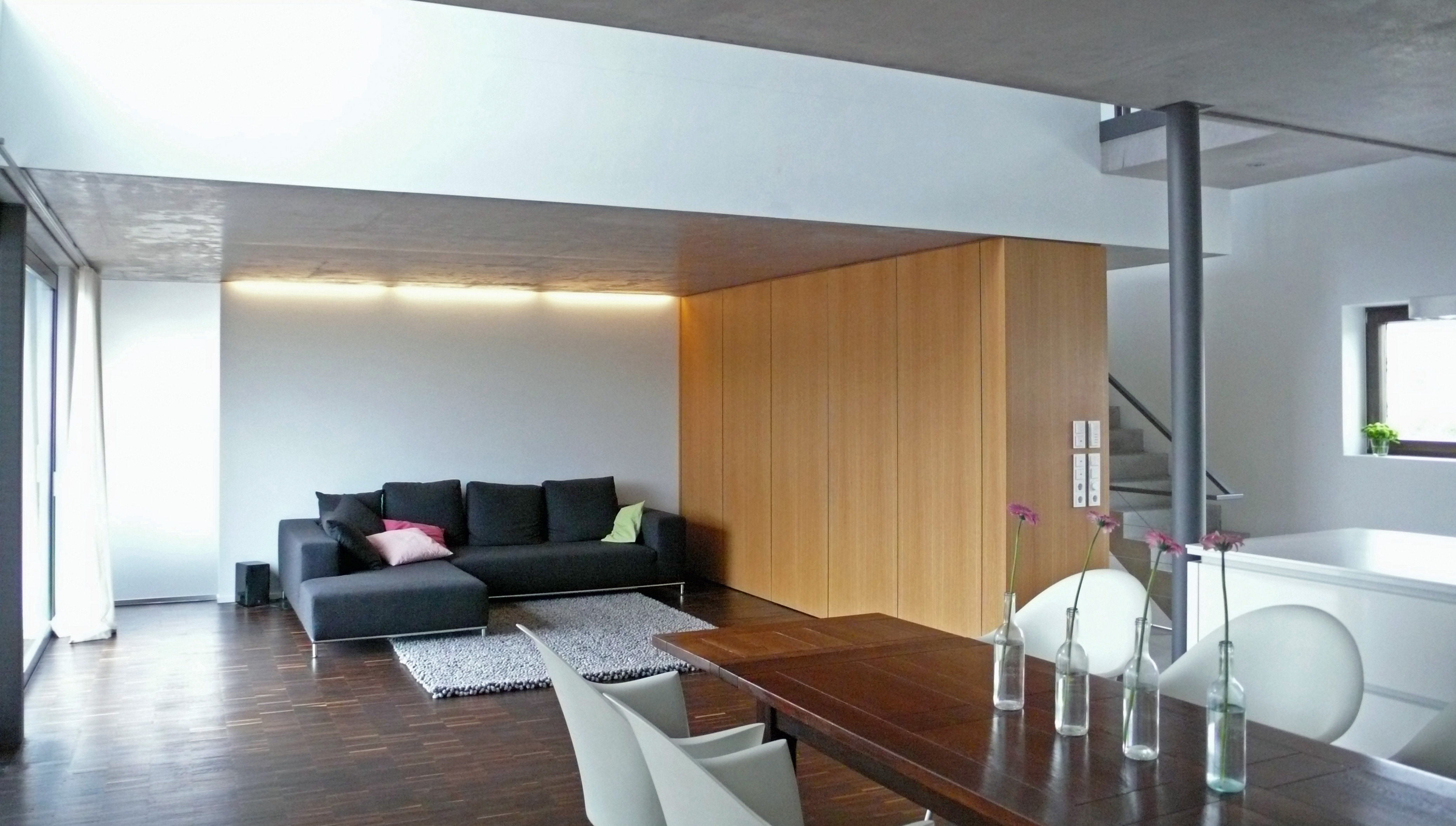 Das Haus ist in zwei Bereiche unterschiedlicher Qualität unterteilt. Ein großer Wohnraum mit Küche und Arbeitsplatz, der sich zum Garten hin öffnet sowie Einzelzimmer für Kinder und Eltern im Obergeschoss. Beide Lebensbereiche sind durch einen Luftraum, der ungewohnte Sichtverbindungen zulässt, verknüpft.