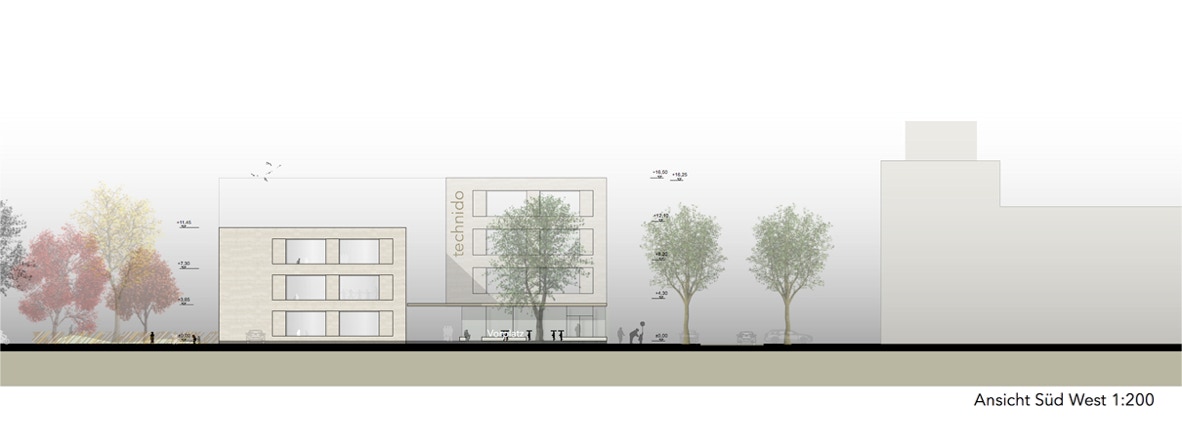 Der 4-geschossige, L-förmige Baukörper der Gemeinschaftsschule übernimmt die geplante Gebäudeflucht entlang der Konrad-Zuse-Straße und umschließt das Areal auch auf der Nordseite. Der 3-geschossige Baukörper der Grundschule und Kindertagesstätte bildet den südwestlichen Abschluss und vermittelt in Höhe und Form zu der geplanten Bebauung in zweiter Reihe sowie zum Grünstrahl.